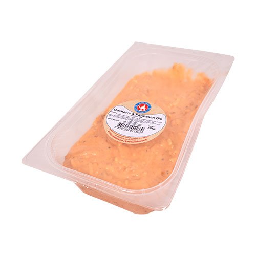 Ingredients: Parmesan Cheese (50%) [Pasteurised Cow’s MILK, Salt, Microbial Rennet, Culture], Cashew NUT (32%), Sundried Tomatoes, Sunflower Oil, Garlic, Parsley, Chillies, Salt.